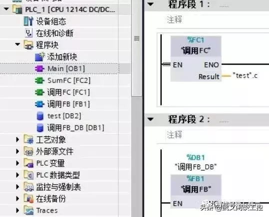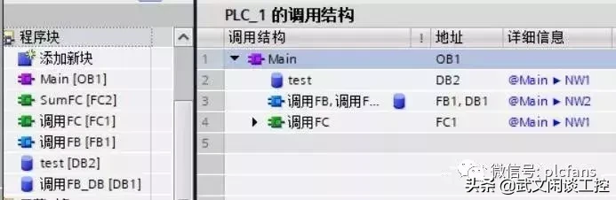 图2 Main调用结构 图1显示了Main程序具体内容,图2显示了Main程序的调用结构。图中很多元素的概念,我们暂时不需要了解,但是可以看到一些整体概念,Mian程序包含程序段1(NW1)和程序段2(NW2),在Main的调用结构中包含了3个元素test、调用FB和调用FC。其实应该是4个,还有一个嵌套在<调用FC>中,点击<调用FC>左侧箭头,出现如下图所示