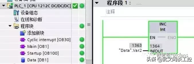 图11 添加循环中断事件OB块 在实验程序里,通过INC指令把DB1块里面的变量,每隔1秒加1,运行效果如下: