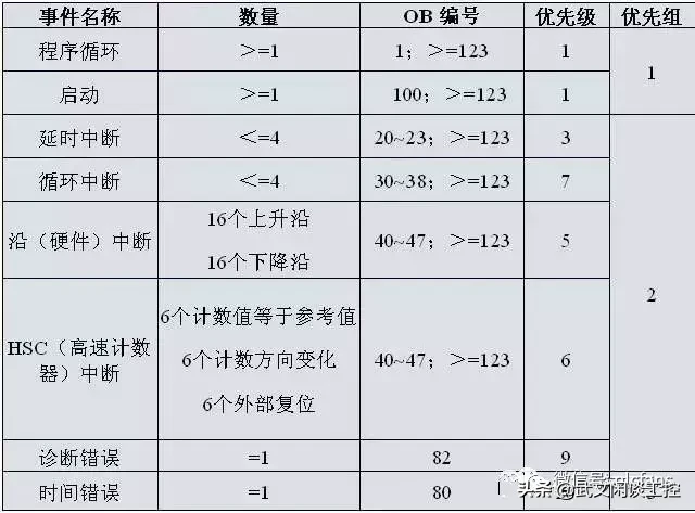 图4 OB分类 我们来分析上图中的OB类型。OB块主要用于程序循环、启动、延时中断、循环中断、硬件中断、HSC中断、诊断错误和时间错误八大事件。OB块还有两个属性是编号和优先级,优先级越高,中断级别越高。在同样的优先级别,OB编号越小,越优先执行。从图1中,我们看到Main程序的地址在OB1,是一个循环运行程序,优先级为1较低。时间错误事件的优先级最高,当发生该事件时,会暂停执行Main程序,优先执行时间错误事件OB块。程序循环OB类块的编号属性为"1;>=123",意为我们可以创建多个类似OB块。因为新建程序默认OB编号为1,假设我们要创立该事件类型OB块,那么默认编号为123起,同时OB1的执行要优先于OB123。诊断错误事件OB块和时间错误OB块只有一个。