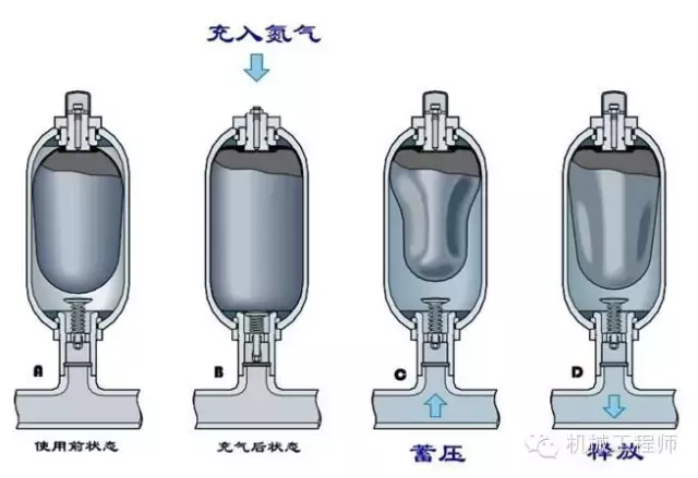 液体在压力作用下,体积的变化(在温度不变的情况下)非常的微小,所以如果没有动力源(也就是高压液体的补充),液体的压力会迅速降低。 而气体的弹性则要大得多,因为气体是可压缩的,在有较大的体积变化情况下,气体仍然有可能保持相对高的压力。因此,蓄能器在进行液压系统的液压油补充时,液体的体积已经变化的情况下,高压的气体可以继续维持液压油的压力,而不至于由于液压油的补充,容器内的液压油体积变小,导致液压油的迅速失压。 至于氮气,主要的原因是氮气性质稳定,不具有氧化或者还原的性能,这个对于液压油性能的保持来说非常有好处,不至于引起液压油的氧化/还原变性! 氮气是预充压力,被装在蓄能器的气囊中,与液压油是隔开的! 当你往蓄能器中充液压油时,由于氮气囊对液压油的压力作用,即液压油的压力等于氮气压力,随着液压油的冲入,氮气囊被压缩,氮气压力增大,液压油的压力跟随增大,直到液压油充到设定的压力! 蓄能器的作用就是提供一定压力的液压油,这个压力液压油就是靠氮气的作用力产生的! 三、蓄能器的主要作用 某些液压系统的执行元件是间歇动作,总的工作时间很短,有些液压系统的执行元件虽然不是间歇动作,但在一个工作循环内(或一次行程内)速度差别很大。在这种系统中设置蓄能器后,即可采用一个功率较小的泵,以减小主传动的功率,使整个液压系统的尺寸小、重量轻、价格便宜。 2、作紧急动力源 对某些系统要求当泵发生故障或停电(对执行元件的供油突然中断)时,执行元件应继续完成必要的动作。例如为了安全起见,液压缸的活塞杆必须内缩到缸内。在这种场合下,需要有适当容量的蓄能器作紧急动力源。 3、补充泄漏和保持恒压 对于执行元件长时间不动作,而要保持恒定压力的系统,可用蓄能器来补偿泄漏,从而使压力恒定。 4、吸收液压冲击 由于换向阀突然换向,液压泵突然停车,执行元件的运动突然停止,甚至人为的需要执行元件紧急制动等原因,都会使管路内的液体流动发生急剧变化,而产生冲击压力(油击)。虽然系统中设有安全阀,但仍然难免产生压力的短时剧增和冲击。这种冲击压力,往往引起系统中的仪表、元件和密封装置发生故障甚至损坏或者管道破裂,此外还会使系统产生明显的振动。若在控制阀或液压缸冲击源之前装设蓄能器,即可吸收和缓和这种冲击。 5、吸收脉动、降低噪声 泵的脉动流量会引起压力脉动,使执行元件的运动速度不均匀,产生振动、噪声等。在泵的出口处并联一个反应灵敏而惯性小的蓄能器,即可吸收流量和压力的脉动,降低噪声。 (来源:机械工程师,版权归原作者)