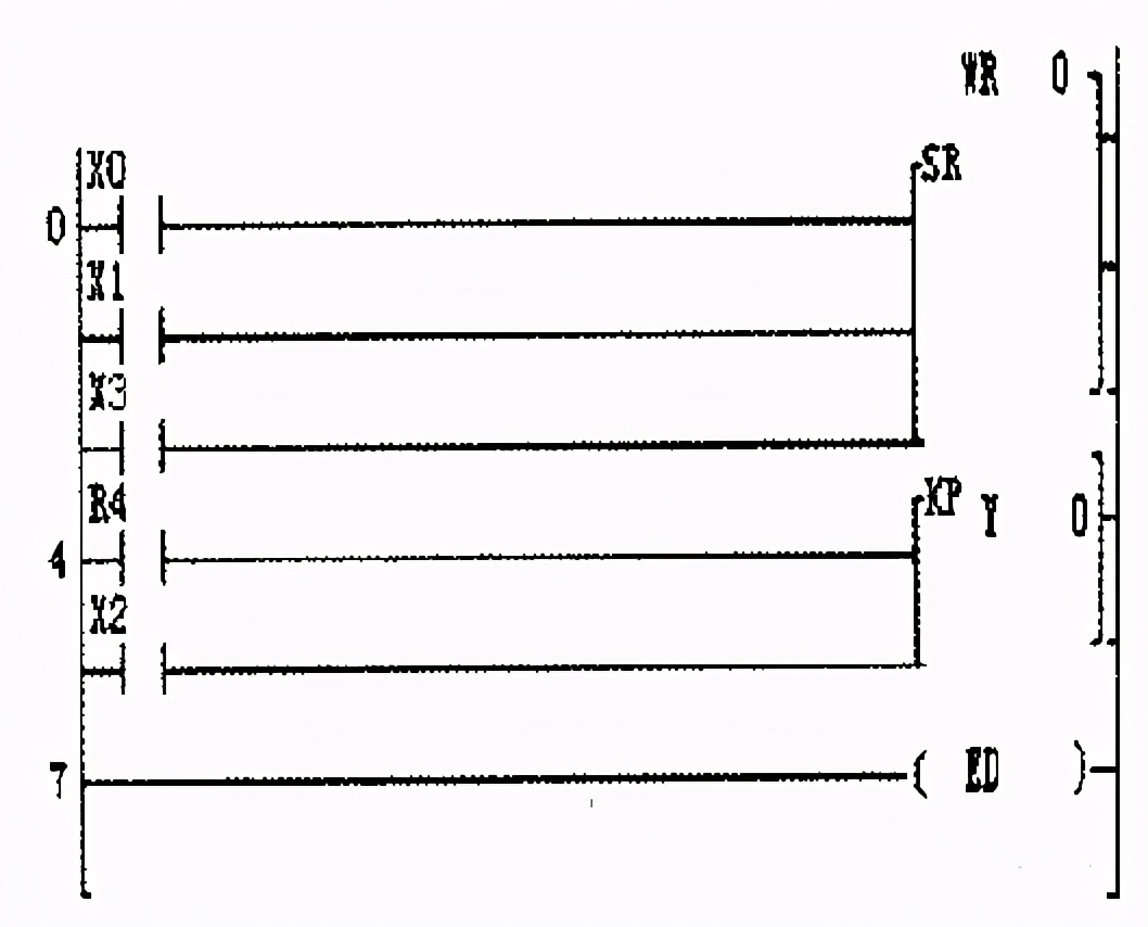 图7所示程序中,WR0即为字元件,是左移位指令SR的编程元件,而Y0为输出软继电器的线圈,X0、X1、X2、X3则为输人软继电器的触点,其中第4步的R4触点为位元件R4的常开触点,而位元件R4又是字元件WR0中的一位,因此其状态受限于WR0的移位结果。