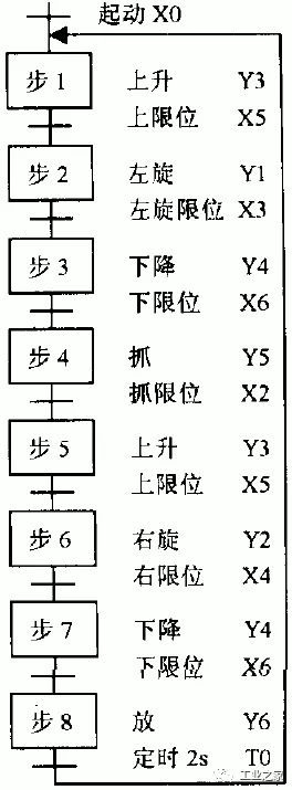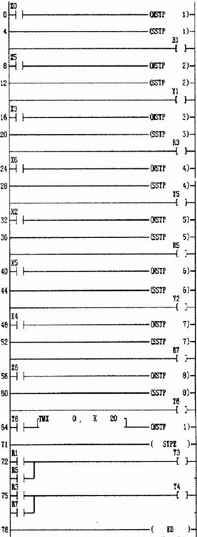 从机械手动作流程图可以看出,这个控制任务每个循环的工作可以划分为八步,其中第1步与第5步动作相同,均为上升;第3步和第7步动作相同,均为下降。在利用步进指令进行编程时,这两个工步所对应的程序段的输出不能直接设置为Y3、Y4,同一个输出使用两次则会出现语法错误。这时应考虑使用用于存储中间状态的内部通用继电器Rn来解决这个问题。如图7所示梯形图程序,其中R1、R5分别被定义为第1步与第5步的输出,R3、R7分别被定义为第3步与第7步的输出,在步进结束后再将R1、R5的状态输出到上升Y3,将R3、R7的状态输出到下降Y4,通过这样的方法可方便解决顺序控制任务中若干工步输出相同的问题。