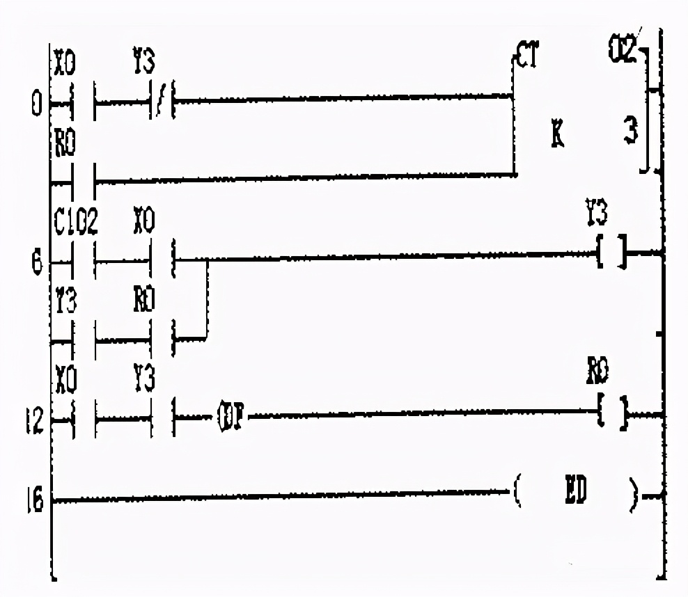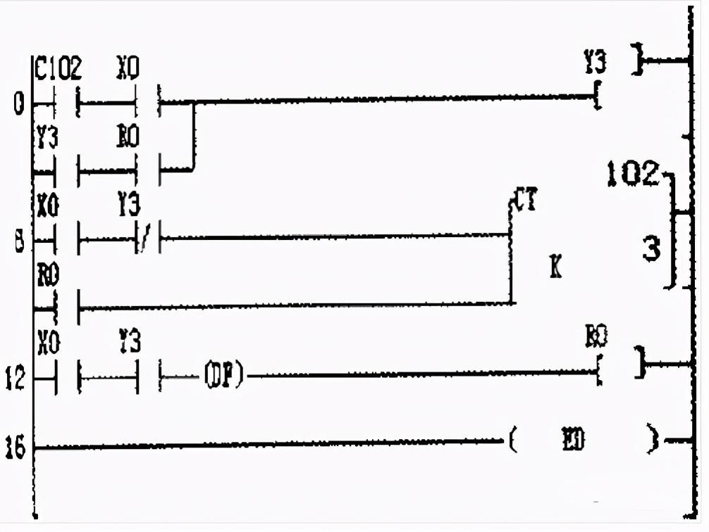 上面两个程序中,输出Y3、计数器CTl02及内部通用继电器R0前面的逻辑条件均相同,仅仅是计数器CTl02所在语句位置发生了变化,而两段程序的运行结果就截然不同。这是因为CTl02对输出Y3的影响方式发生了变化。