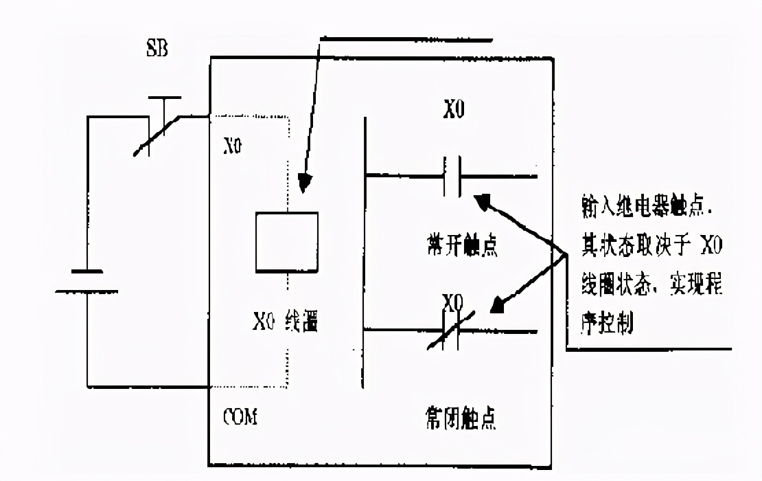 若按下该按钮,则输入继电器X0线圈状态为"0"断电状态,程序中所有X0触点均恢复常态。如果输入继电器连接的输入设备是按钮SB0的常开触点,则情况恰好相反:在该按钮未按下时,输入继电器X0线圈状态为"0"断电状态,程序中所有X0触点均不动作;若按下该按钮,输入继电器X0线圈状态为"1"通电状态,程序中所有X0触点均动作。