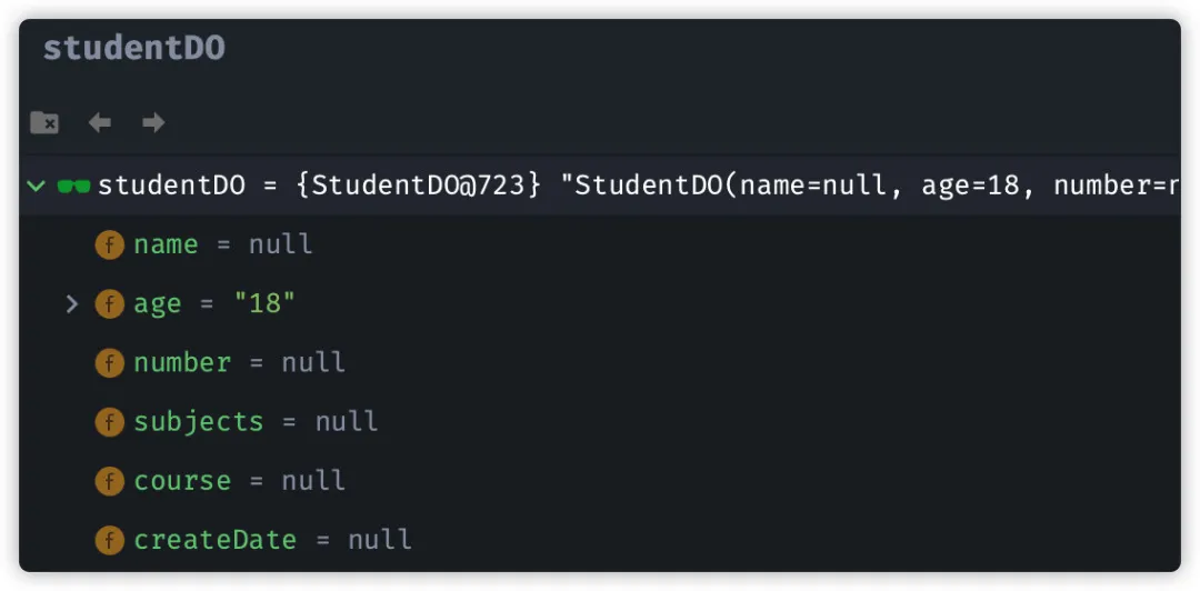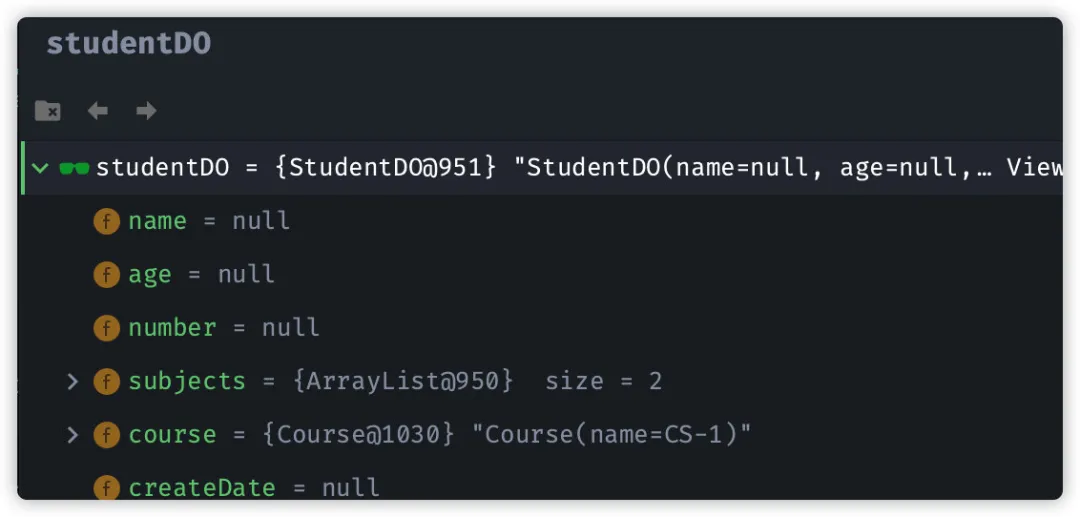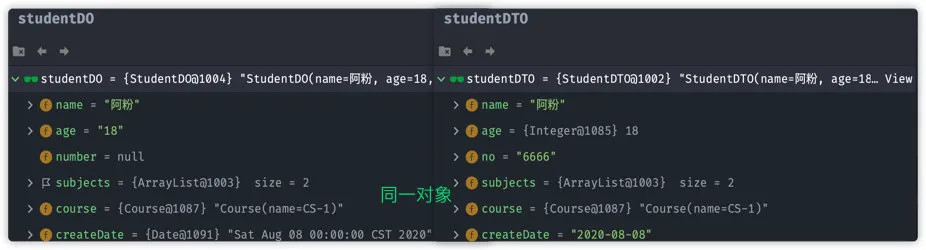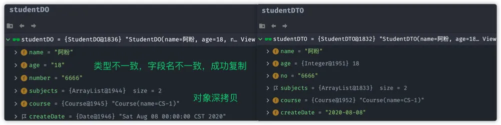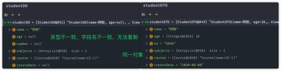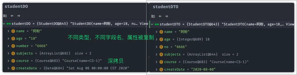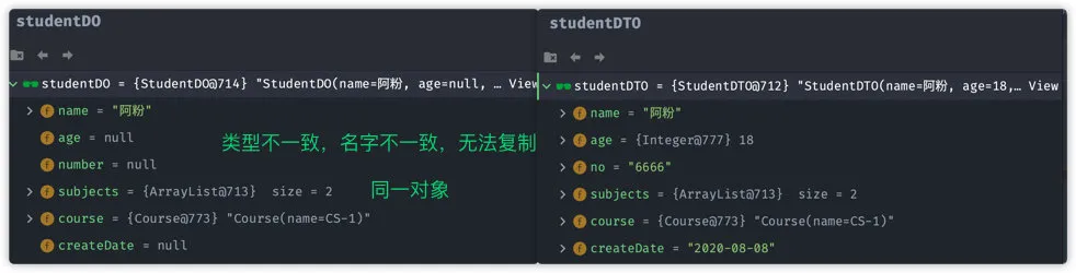 StudentDTO studentDTO = new StudentDTO();studentDTO.setName("阿粉");studentDTO.setAge(18);studentDTO.setNo("6666");List<String> subjects = new ArrayList<>();subjects.add("math");subjects.add("english");studentDTO.setSubjects(subjects);studentDTO.setCourse(new Course("CS-1"));studentDTO.setCreateDate("2020-08-08");StudentDO studentDO = new StudentDO();BeanUtils.copyProperties(studentDO, studentDTO);