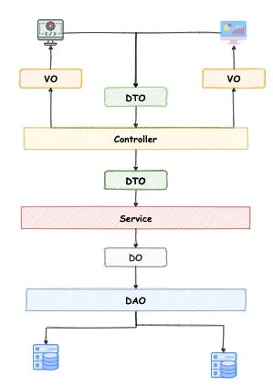 当需要从数据查询数据页面展示时,查询数据经过三层架构将会从 DO 转为 DTO,最后再转为 VO,然后在页面中展示。