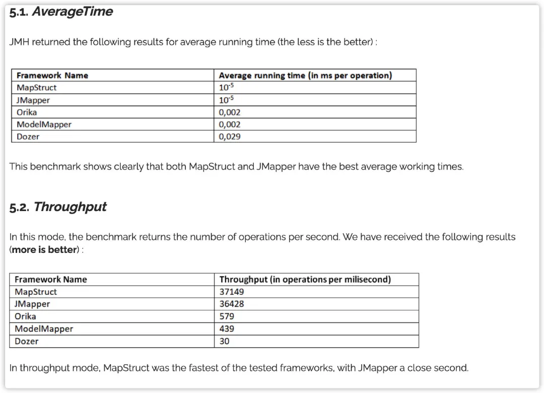 可以看到 MapStruct 的性能可以说还是相当优秀。那么如果你的业务对于性能,响应等要求比较高,或者你的业务存在大数据量导入/导出的场景,而这个代码存在对象转化,那就切勿使用 Apache Beanutils, Dozer 这两个工具类。
