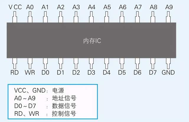 内存实际上是一种名为内存IC的电子元件,内存IC中有电源、地址信号、数据信号、控制信号等用于输入输出的大量引脚(IC的引脚),通过为其指定地址,来进行数据的读写。VCC和GND是电源,A0~A9是地址信号的引脚,D0~D7是数据信号的引脚,RD和WR是控制信号的引脚。将电源连接到VCC和GND后,就可以给其他引脚传递比如0或者1这样的信号。大多数情况下,+ 5V的直流电压表示1,0V表示0。 上面的内存IC能存储多少数据呢,数据信号引脚有D0~D7共八个,表示一次可以输入输出8位(=1字节)的数据。此外,地址信号引脚有A0~A9共十个,表示可以指定0000000000~1111111111共1024个地址。而地址用来表示数据的存储场所,因此我们可以得出这个内存IC中可以存储1024个1字节的数据。因为1024=1K,所以该内存IC的容量就是1KB。 现在大家使用的计算机至少有512M的内存。这就相当于512000个(512MB÷1KB=512000K)1KB的内存IC。当然,一台计算机中不太可能放入如此多的内存IC。通常情况下,计算机使用的内存IC中会有更多的地址信号引脚,这样就能在一个内存IC中存储数十兆字节的数据。因此,只用数个内存IC,就可以达到512MB的容量。如上实图1GB的内存条,引脚比较多。 内存的读写