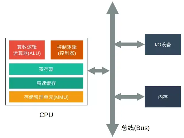 下图是CPU和计算机的基本架构,我们以此图来说明物理/逻辑地址在CPU和计算机中如何被解析处理的:
