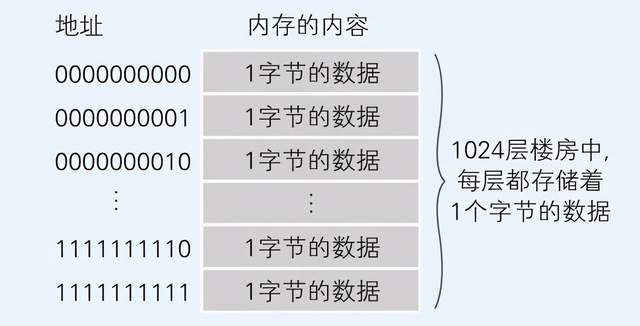 内存的逻辑模型可以简单理解为每层都存储着数据的楼房,在这个楼房中,1层可以存储1个字节的数据,楼层号表示的就是地址。同时并不需要过多地关注内存IC的电源和控制信号等。当内存为1KB时,表示有1024层的楼房(编程语言的数据类型空间没有在这里体现):