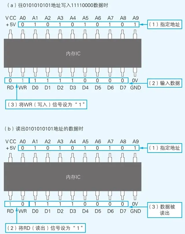 内存的写入的实现,我们继续来看刚才所说的1KB的内存IC。首先,我们假设要往该内存IC中写入1字节的数据。为了实现该目的,可以给VCC接入+5V,给GND接入0V的电源,并使用A0~A9的地址信号来指定数据的存储场所,然后再把数据的值输入给D0~D7的数据信号,并把WR(write=写入的简写)信号设定成1。执行完这些操作,就可以在内存IC内部写入数据(如下图中的a)了。 内存的读取的实现,读出数据时,只需通过A0~A9的地址信号指定数据的存储场所,然后再将RD(read=读出的简写)信号设成1即可。执行完这些操作,指定地址中存储的数据就会被输出到D0~D7的数据信号引脚(下图中的b)中。