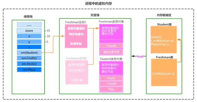 下面来看更加复杂的对象的存储: //定义一个学生的基类class Student{ public void Study(){ Console.WriteLine("学习!"); } public virtual int Credit(int x,int y){ Console.WriteLine($"总学分:{x+y},必修:{x},选修:{y}"); return x+y; } public static void Play(string s){ Console.WriteLine("玩耍:"+s); }}//大一学生class Freshman:Student{ //重写学分的方法 public override int Credit(int x,int y){ Console.WriteLine($"大一学生总学分:{x+y}"); return x+y; }}//实例化小明对象:public void XiaoMing(){ int score; //1.总学分 //小明是大一学生 Student xm=new Freshman(); //2.实例化对象 score=xm.Credit(30,5); //3.调用虚方法,实际调用子类重写之后的方法 xm.Study(); //4.调用实例方法 xm.Play("游戏"); //5.调用静态方法,内存中,不管有多少个实例对象,静态成员只有一份 // 第2个实例对象:小花 // Student xh=new Freshman(); //体现在图中的Freshman实例2}如图: