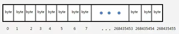 如上图中,这是一个256M的内存,他一共有256x1024x1024 = 268435456个字节,那么它的地址范围就是 0 ~268435455 。
