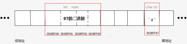 我们可以大致画出变量ch和num在内存模型中的存储。(假设 char占1个字节,int占4字节)