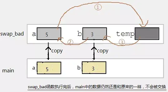 #include<stdio.h>void swap_bad(int a,int b);void swap_ok(int*pa,int*pb);int main(){ int a = 5; int b = 3; swap_bad(a,b); //Can`t swap; swap_ok(&a,&b); //OK return 0;}//错误的写法void swap_bad(int a,int b){ int t; t=a; a=b; b=t;}//正确的写法:通过指针void swap_ok(int*pa,int*pb){ int t; t=*pa; *pa=*pb; *pb=t;}