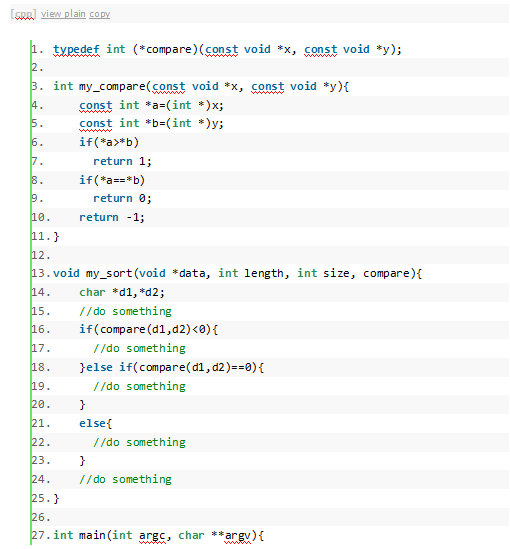 有过较深入的C编程经验的人应该都接触过。C的标准库中就有使用,例如在strlib.h头文件的qsort函数,它的原型为: