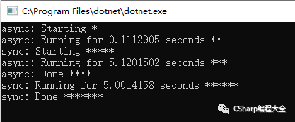 { Task delay = asyncTask(); syncCode(); delay.Wait(); Console.ReadLine(); } static async Task asyncTask() { var sw = new Stopwatch(); sw.Start(); Console.WriteLine("async: Starting *"); Task delay = Task.Delay(5000); Console.WriteLine("async: Running for {0} seconds **", sw.Elapsed.TotalSeconds); await delay; Console.WriteLine("async: Running for {0} seconds ***", sw.Elapsed.TotalSeconds); Console.WriteLine("async: Done ****"); } static void syncCode() { var sw = new Stopwatch(); sw.Start(); Console.WriteLine("sync: Starting *****"); Thread.Sleep(5000); Console.WriteLine("sync: Running for {0} seconds ******", sw.Elapsed.TotalSeconds); Console.WriteLine("sync: Done *******"); } }}