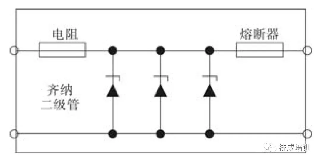 安全栅分为齐纳式安全栅和隔离式安全栅两类。齐纳式安全栅是最早出现的安全栅。它的核心元件是齐纳二极管,限流电阻及快速熔断丝,原理图如下图所示: