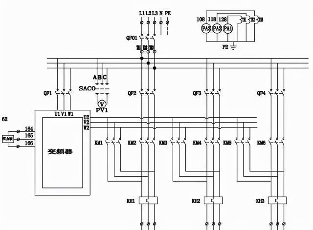 那么变频器如何实现一拖多的功能?下面仅仅对一次电气原理图做出示例。二次电气原理图需要根据控制要求设计,此处暂不赘述。