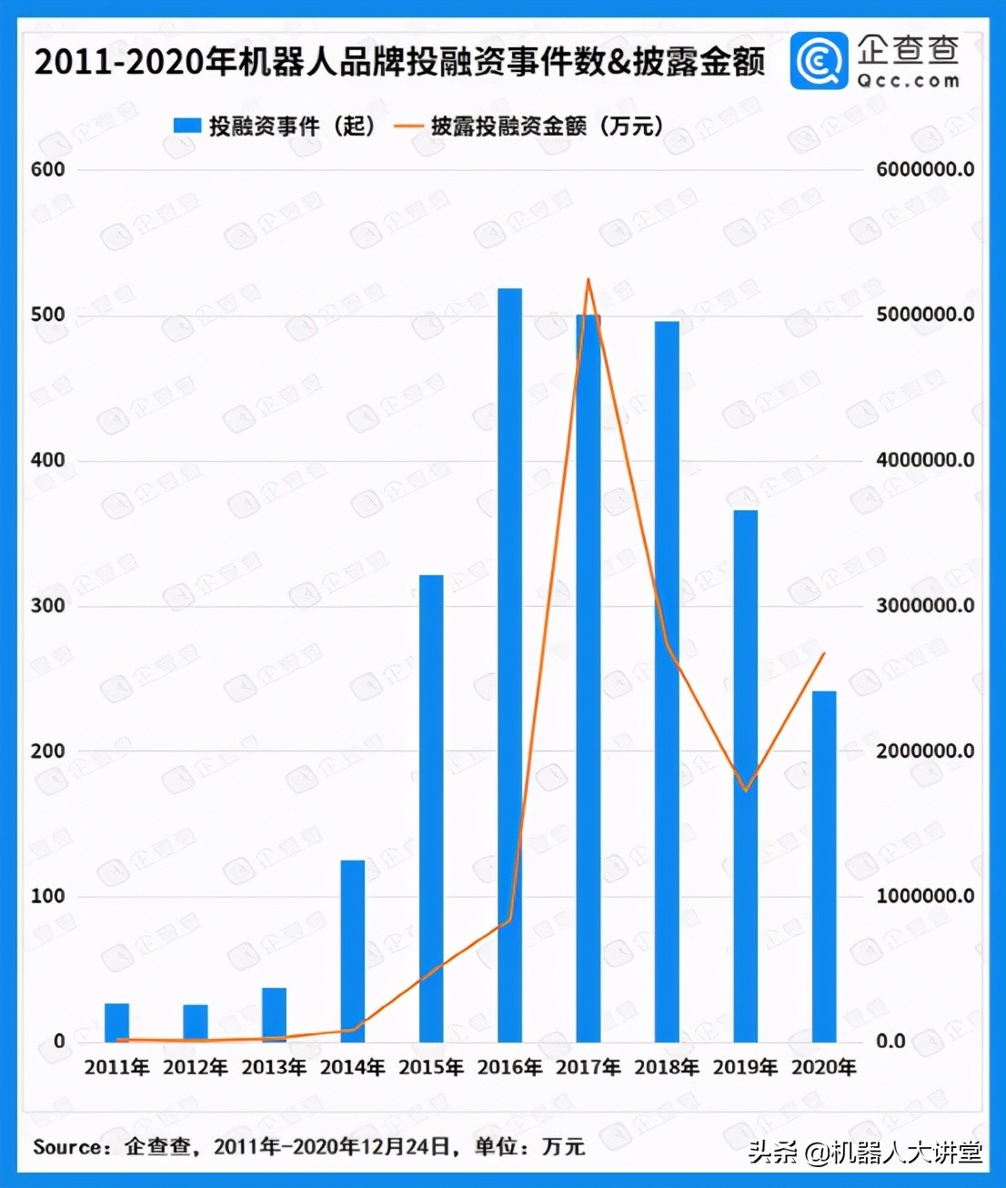 (高仙清洁机器人) 美团的新投资思路用王兴的一句话能很好概括:“机器人意味着智能硬件,我更看好服务行业的机器人技术。随着技术和机器人的不断进步和发展,我们在提高效率、降低成本和为客户创造更好体验方面拥有巨大的潜力。”与美团这一决策相对应的是,美团将需要为470万人进行缴纳社保,其意味不言而喻。 ▍综合数据对比 半年报数据显示,2021年初截至8月17日,腾讯投资事件有200起,字节跳动投资事件52起,阿里巴巴41起,百度27起,美团15起。从这些巨头的投资中可以看出,机器人只是投资中为数不多的试探,互联网巨头的投资主线没有太多变化,但社会大环境改革造成的影响,也正进一步倒逼这些曾经叱咤风云的巨头们作出改变和选择,转入投资机器人是纠正互联网巨头错误发展路线选择的可行方式。 机器人行业一直在有序向前发展。企查查数据显示,近十年我国机器人赛道共发生投融资事件2661件,总投融资金额超1385亿元。2014年开始,机器人赛道的投融资活动开始活跃,共发生投融资125件,总金额超过8亿元。到了2016年,融资事件呈井喷状态,共519起,随后逐年递减。2017年共发生投融资501起,总金额约524.7亿,成为十年来投融资总金额最高的一年。2020年共发生投融资事件242起,总金额约为267.7亿元。