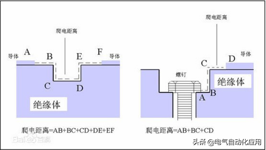 爬电距离是由电气设备的额定电压、绝缘材料的耐泄痕性能以及绝缘材料表面形状等因素决定的,它决定了电气设备耐受环境的水平。爬电距离取决于工作电压的有效值、绝缘材料对其影响较大。