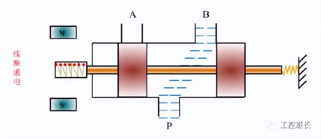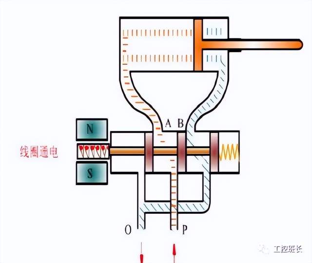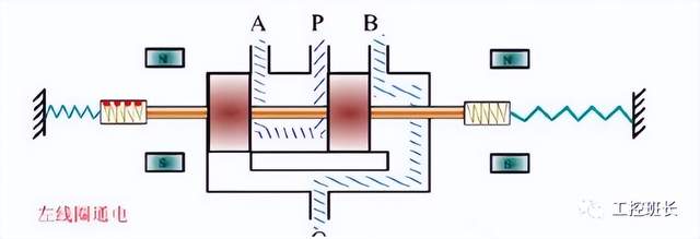 两位四通电磁阀: 在气动或液动系统中,利用活塞产生足够的位移。为了控制活塞的运动方向,启动和停止,常用到多通电磁阀,最典型的是四通电磁阀。 当线圈无电流时,弹簧将铁心向左推出线圈,如图所示,用带有颜色的箭头表示高压油从孔P流入,经过孔B进入油缸右腔,推动活塞向左运动,左腔的油经过A送往O排出。线圈通电后,滑阀移动,高压油自P送往A,压力作用在活塞的左边,使活塞向右运动,右腔的油经过B和O排出。
