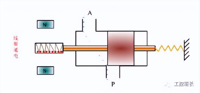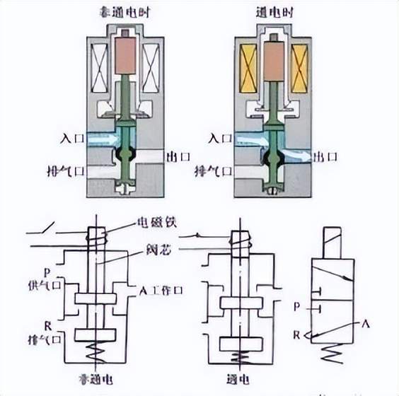 两位三通:当线圈带电时,活塞移动,BP通,AP不通,流体流过BP。断电时AP通,BP不通,流体流过AP。