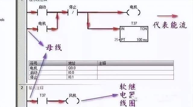 在分析梯形图的逻辑关系时,为了借用继电器电路图的分析方法,可以想象左右两侧母线(左母线和右母线)之间有一个左正右负的直流电源电压,母线之间有“能流”从左向右流动。右母线可以不画出。