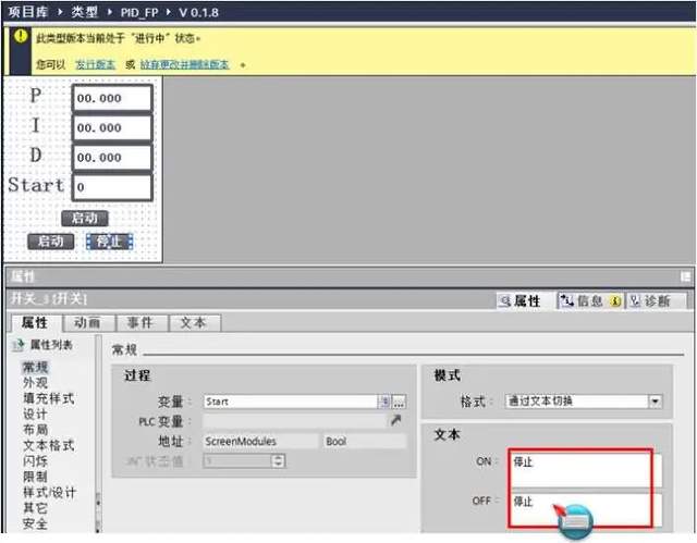 再添加 2 个开关, 按照图 07 做相同操作。只是其中一个开关的 ON、 OFF 文本均设置为“启动”,另一个开关的 ON、 OFF 文本均设置为“停止”,如图 08 。