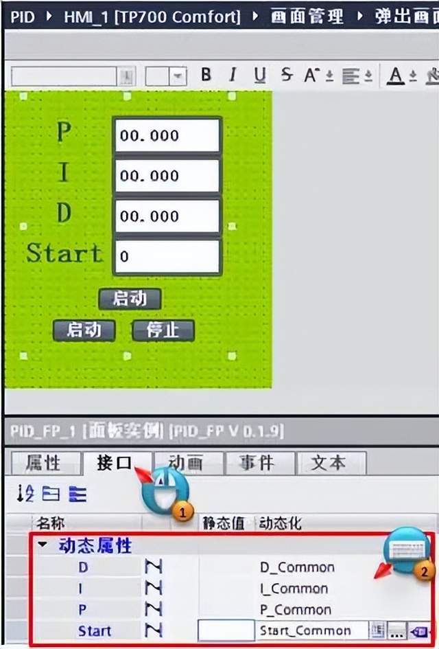 当索引变量 PID_index 为 0 时, P_Common 为变量 PID_DB_PID1.P 的值; 当索引变量 PID_index 为 1 时, P_Common 为变量 PID_DB_PID2.P 的值; 当索引变量 PID_index 为 2 时, P_Common 为变量 PID_DB_PID3.P 的值。 为指针化变量 “I_Common”、 “D_Common”及“Start_Common”做相同设置,并将索引值对应到各自实际变量上。 4. 在库中创建面板, 如图 04 。