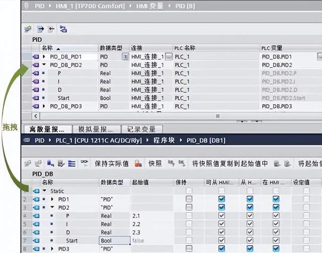 那么为同类设备在 HMI 程序中绘制一个面板( Faceplate),然后通过弹出画面加载同一个面板来分别显示不同设备的参数,将使得组态工作量大大减少。本例将介绍如何通过在弹出画面中调用同一个面板来分别显示 3 组设备的 PID 调节参数和设备启停信号参数,以及通过开关按钮对 Bool 变量进行置位/复位操作的方法。 步骤 1. 在 HMI 中创建多个同类设备的相关参数变量( PID 数据类型为 PLC 程序中定义的 UDT PLC 数据类型) ,如图 01 。
