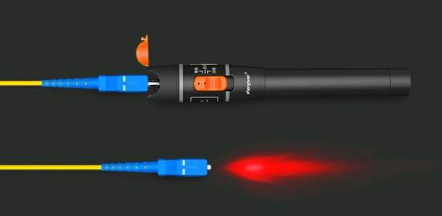 7、光纤打光激光笔打光有两个作用,一是测光纤是否断开,对面如果能看到光就证明物理链路是通的,中间没有断点,光纤就是OK的;二是用于寻线。那么多线,怎么知道哪根是哪根,其实很简单,打光后哪个亮哪个就是要找的线。