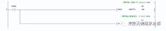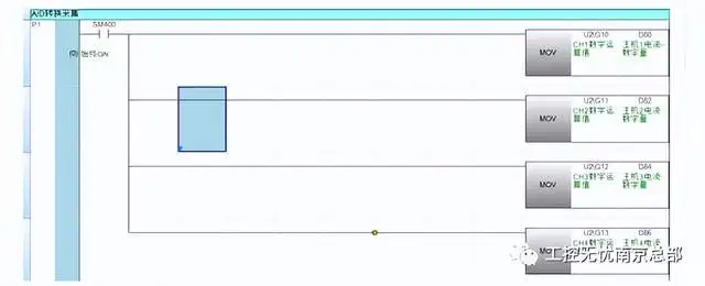 说明:读取单元号为2的模拟量模块输入通道值,四个通道表示为:U2/G10、U2/G11、U2/G12、U2/G13;以此类推,单元号为3的模拟量输入模块通道表示为:U3/G10、U3/G11、U3/G12、U3/G13。 注意:此程序段没有设置通道电压或者电流的对应关系,所以默认FX3模拟量输入模块通道A/D转换关系为,0-20mA对应0-16000。 模拟量通道设定可参考Works2软件编程方法,如下: