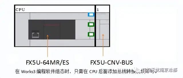 FX5U-64MR/ES FX5U-CNV-BUS 在Works3编程软件组态时,只需在CPU后面添加总线转换模块即可。 二、 编程示例2.1编程说明:编制程序时,首先需要根据智能模块数来确定模块的单元号,然后在程序中表示出单元号的通道。本次示例单元号如下: | FX5U-64MR/ES | FX5U-CNV-BUS | FX3U-4AD | FX3U-4AD |