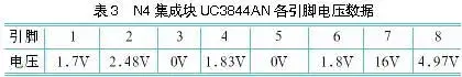 N4集成块UC3844AN各引脚电压数据如表3所示。