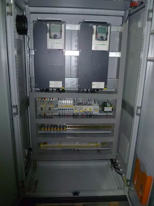 如果要正确的使用变频器, 必须认真地考虑散热的问题。变频器的故障率随温度升高而成指数的上升。使用寿命随温度升高而成指数的下降。环境温度升高10度,变频器使用寿命减半。因此,我们要重视散热问题啊!在变频器工作时,流过变频器的电流是很大的, 变频器产生的热量也是非常大的,不能忽视其发热所产生的影响。 通常,变频器安装在控制柜中。我们要了解一台变频器的发热量大概是多少,可以用以下公式估算: 发热量的近似值= 变频器容量(KW)×55 [W]在这里, 如果变频器容量是以恒转矩负载为准的(过流能力150% * 60s) 如果变频器带有直流电抗器或交流电抗器, 并且也在柜子里面, 这时发热量会更大一些。 电抗器安装在变频器侧面或测上方比较好。这时可以用估算: 变频器容量(KW)×60 [W]因为各变频器厂家的硬件都差不多, 所以上式可以针对各品牌的产品. 注意: 如果有制动电阻的话,因为制动电阻的散热量很大, 因此最好安装位置最好和变频器隔离开, 如装在柜子上面或旁边等。那么, 怎样采能降低控制柜内的发热量呢? 当变频器安装在控制机柜中时,要考虑变频器发热值的问题。根据机柜内产生热量值的增加,要适当地增加机柜的尺寸。 因此,要使控制机柜的尺寸尽量减小,就必须要使机柜中产生的热量值尽可能地减少。如果在变频器安装时,把变频器的散热器部分放到控制机柜的外面,将会使变频器有70%的发热量释放到控制机柜的外面。由于大容量变频器有很大的发热量,所以对大容量变频器更加有效。还可以用隔离板把本体和散热器隔开, 使散热器的散热不影响到变频器本体。这样效果也很好。变频器散热设计中都是以垂直安装为基础的,横着放散热会变差的! 关于冷却风扇一般功率稍微大一点的变频器, 都带有冷却风扇。同时,也建议在控制柜上出风口安装冷却风扇。进风口要加滤网以防止灰尘进入控制柜。 注意控制柜和变频器上的风扇都是要的,不能谁替代谁。 另外,散热问题还要注意以下两个问题: (1)在海拔高于1000m的地方,因为空气密度降低,因此应加大柜子的冷却风量以改善冷却效果。理论上变频器也应考虑降容,1000m每-5%。但由于实际上因为设计上变频器的负载能力和散热能力一般比实际使用的要大, 所以也要看具体应用。 比方说在1500m的地方,但是周期性负载,如电梯,就不必要降容。 (2)开关频率:变频器的发热主要来自于IGBT,IGBT的发热有集中在开和关的瞬间。 因此开关频率高时自然变频器的发热量就变大了。有的厂家宣称降低开关频率可以扩容, 就是这个道理。
