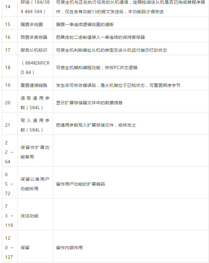 Modbus协议包括ASCII、RTU、TCP等,并没有规定物理层。此协议定义了控制器能够认识和使用的消息结构,而不管它们是经过何种网络进行通信的。标准的Modicon控制器使用RS232C实现串行的Modbus。Modbus的ASCII、RTU协议规定了消息、数据的结构、命令和就答的方式,数据通讯采用Maser/Slave方式,Master端发出数据请求消息,Slave端接收到正确消息后就可以发送数据到Master端以响应请求;Master端也可以直接发消息修改Slave端的数据,实现双向读写。 Modbus协议需要对数据进行校验,串行协议中除有奇偶校验外,ASCII模式采用LRC校验,RTU模式采用16位CRC校验,但TCP模式没有额外规定校验,因为TCP协议是一个面向连接的可靠协议。另外,Modbus采用主从方式定时收发数据,在实际使用中如果某Slave站点断开后(如故障或关机),Master端可以诊断出来,而当故障修复后,网络又可自动接通。因此,Modbus协议的可靠性较好。 对于Modbus的ASCII、RTU和TCP协议来说,其中TCP和RTU协议非常类似,我们只要把RTU协议的两个字节的校验码去掉,然后在RTU协议的开始加上5个0和一个6并通过TCP/IP网络协议发送出去即可。 1通讯传送方式:通讯传送分为独立的信息头,和发送的编码数据。以下的通讯传送方式定义也与ModBusRTU通讯规约相兼容: 初始结构 = ≥4字节的时间 地址码 = 1 字节 功能码 = 1 字节 数据区 = N 字节 错误校检 = 16位CRC码 结束结构 = ≥4字节的时间 地址码:地址码为通讯传送的第一个字节。这个字节表明由用户设定地址码的从机将接收由主机发送来的信息。并且每个从机都有具有唯一的地址码,并且响应回送均以各自的地址码开始。主机发送的地址码表明将发送到的从机地址,而从机发送的地址码表明回送的从机地址。 功能码:通讯传送的第二个字节。ModBus通讯规约定义功能号为1到127。本仪表只利用其中的一部分功能码。作为主机请求发送,通过功能码告诉从机执行什么动作。作为从机响应,从机发送的功能码与从主机发送来的功能码一样,并表明从机已响应主机进行操作。如果从机发送的功能码的最高位为1(比如功能码大与此同时127),则表明从机没有响应操作或发送出错。 数据区:数据区是根据不同的功能码而不同。数据区可以是实际数值、设置点、主机发送给从机或从机发送给主机的地址。 CRC码:二字节的错误检测码。 2通讯规约:当通讯命令发送至仪器时,符合相应地址码的设备接通讯命令,并除去地址码,读取信息,如果没有出错,则执行相应的任务;然后把执行结果返送给发送者。返送的信息中包括地址码、执行动作的功能码、执行动作后结果的数据以及错误校验码。如果出错就不发送任何信息。 1.信息帧结构 地址码 功能码 数据区 错误校验码 8位 8位 N × 8位 16位 地址码:地址码是信息帧的第一字节(8位),从0到255。这个字节表明由用户设置地址的从机将接收由主机发送来的信息。每个从机都必须有唯一的地址码,并且只有符合地址码的从机才能响应回送。当从机回送信息时,相当的地址码表明该信息来自于何处。 功能码:主机发送的功能码告诉从机执行什么任务。表1-1列出的功能码都有具体的含义及操作。 数据区:数据区包含需要从机执行什么动作或由从机采集的返送信息。这些信息可以是数值、参考地址等等。例如,功能码告诉从机读取寄存器的值,则数据区必需包含要读取寄存器的起始地址及读取长度。对于不同的从机,地址和数据信息都不相同。 错误校验码:主机或从机可用校验码进行判别接收信息是否出错。有时,由于电子噪声或其它一些干扰,信息在传输过程中会发生细微的变化,错误校验码保证了主机或从机对在传送过程中出错的信息不起作用。这样增加了系统的安全和效率。错误校验采用CRC-16校验方法。 注:信息帧的格式都基本相同:地址码、功能码、数据区和错误校验码。 2.错误校验 冗余循环码(CRC)包含2个字节,即16位二进制。CRC码由发送设备计算,放置于发送信息的尾部。接收信息的设备再重新计算接收到信息的 CRC码,比较计算得到的CRC码是否与接收到的相符,如果两者不相符,则表明出错。 3Modbus支持的功能码:1、01号命令,读可读写数字量寄存器(线圈状态): 计算机发送命令:[设备地址] [命令号01] [起始寄存器地址高8位] [低8位] [读取的寄存器数高8位] [低8位] [CRC校验的低8位] [CRC校验的高8位] 例:[11][01][00][13][00][25][CRC低][CRC高] 意义如下: <1>设备地址:在一个485总线上可以挂接多个设备,此处的设备地址表示想和哪一个设备通讯。例子中为想和17号(十进制的17是十六进制的11)通讯。 <2>命令号01:读取数字量的命令号固定为01。 <3>起始地址高8位、低8位:表示想读取的开关量的起始地址(起始地址为0)。比如例子中的起始地址为19。 <4>寄存器数高8位、低8位:表示从起始地址开始读多少个开关量。例子中为37个开关量。 <5>CRC校验:是从开头一直校验到此之前。 设备响应:[设备地址] [命令号01] [返回的字节个数][数据1][数据2]...[数据n] [CRC校验的高8位] [CRC校验的低8位] 例:[11][01][05][CD][6B][B2][0E][1B] [CRC高] [CRC低] 意义如下: <1>设备地址和命令号和上面的相同。 <2>返回的字节个数:表示数据的字节个数,也就是数据1,2...n中的n的值。 <3>数据1...n:由于每一个数据是一个8位的数,所以每一个数据表示8个开关量的值,每一位为0表示对应的开关断开,为1表示闭合。比如例子中,表示20号(索引