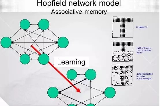 循环网络的非线性单元通常很难分析。它们可以表现为不同的方式:稳定到稳定的状态,振荡,或遵循不可预测的混沌轨迹。一个 Hopfield 网络由二元门限单元组成,它们之间有连续的连接。1982 年,John Hopfield 认识到,如果连接是对称的,就有一个全局能量函数。整个网络的每个二进制「结构」都有能量,而二进制阈值的决策规则使网络可以得到能量函数的最小值。利用这类计算的一种简洁方法是使用记忆作为神经网络的能量最小值。使用能量最小值来表示记忆从而内存可寻址。可以只知道一个项目的部分内容来访问这个项目。这对硬件损坏是极大的。