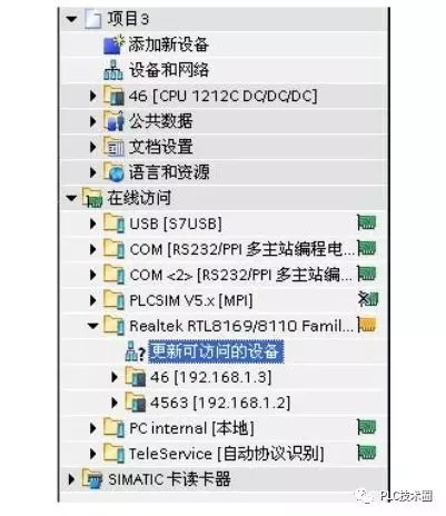 2)打开在线访问下拉菜单,找到本机的网络适配器,双击更新可访问的设备,就会显示本机所连的S7-1200设备