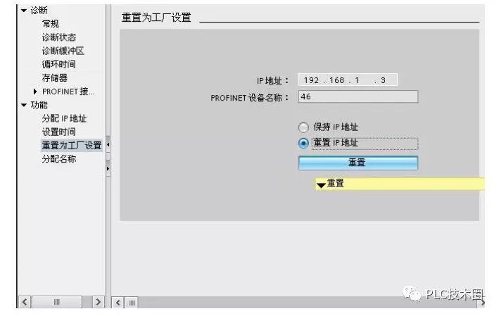 5)复位1200PLC。在步骤(4)的对话框中,选择重置为工厂设置弹出如下对话框选择重置DP地址,单击重置,确定。重置卫之后,PIC的卫地址和子网掩码都修改为0,可以进行步骤(4)的工作。如不复位就修改P地址,会出现无法完成此功能错误。