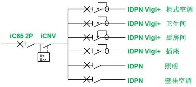 ①安装入户电源是三相380V还是单相220V以及户型总用电负荷选择配电箱总开关; 一般不大于150㎡的户型多为单相供电,使用32A(< 4kW) 或63A(>=4kW) 2P 微型断路器及相应额定电流的自复式过、欠压保护器,同时建议安装In为(标称放电电流)3kA的II类电涌保护器,以保护家中的电子设备免遭雷电侵害。 ②所有出线回路都应选择带漏电保护的开关,以防发生触电漏电危险; ③开关额定电流大小选择: 常用的选择为: 照明回路:10/16A 带漏电保护的C型微型断路器(一位宽度); 一般插座回路:16A或20A(建议)带漏电的C型微型断路器(一位宽度); 厨房插座回路:20A或25A 带漏电的C型微型断路器(一位宽度); 空调插座回路(各自单独回路供电):16A/20A/25A带漏电的C型微型断路器(一位宽度); 卫生间插座回路:20A或25A带漏电的C型微型断路器(一位宽度); 这里顺便提一下, 请务必确认与供电线路载流量、负载工作电流匹配。