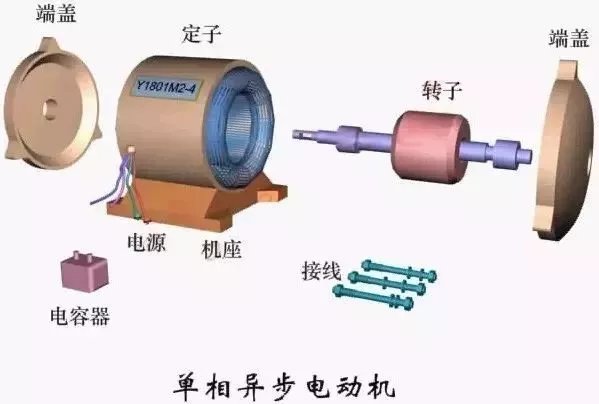 电机主要部件包括:1、机座;2、铁心;3、绕组;4、端盖;5、轴承;6、离心开关或起动继电器和PTC起动器;7、铭牌。