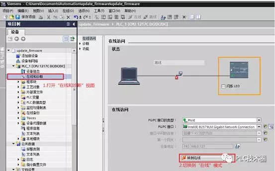 使用TIA 软件更新CPU固件 1. 打开所连接 CPU 的"在线和诊断"(Online and Diagnostics) 视图,并切换到“在线”模式。 图1. 打开“在线和诊断”视图