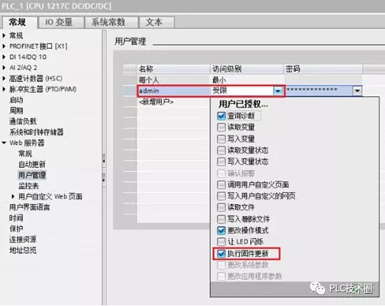 为了使能Web服务器升级固件功能,需要组态Web服务器访问CPU的权限,需要在Web服务器属性的“用户管理”中添加授权的用户名、访问权限和密码。 本例需要开放“执行固件更新”权限,如图5.所示。 图5.添加用户并开放固件更新权限 将上述的Web服务器组态下载到CPU后,授权用户就可以通过Web服务器访问CPU。