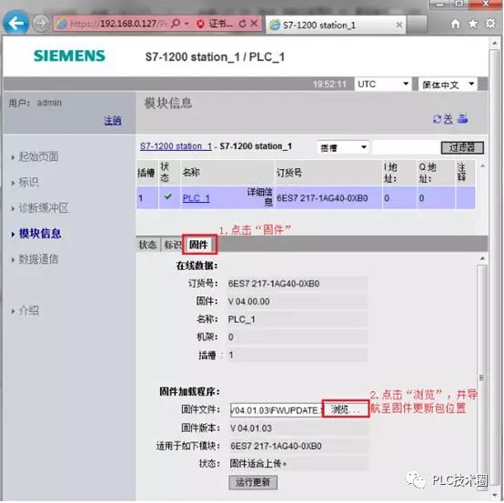 3.在PLC站点信息显示页面,点击“固件”按钮,并"浏览"至固件更新包,点击“运行更新”按钮,即可执行CPU固件更新操作。如图8.所示。 图8.浏览固件并更新
