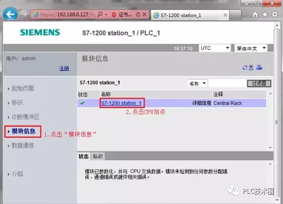 4.登录授权用户后,点击“模块信息”,然后点击相应PLC站点名称,即可查看PLC 站点信息,如图7.所示。 图7.查看模块信息