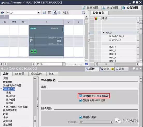 1.启动CPU的Web服务器功能 如果需要通过Web方式更新CPU固件,首先需要在设备组态视图中选择CPU,在CPU属性中使能“启动模块上的Web服务器”。