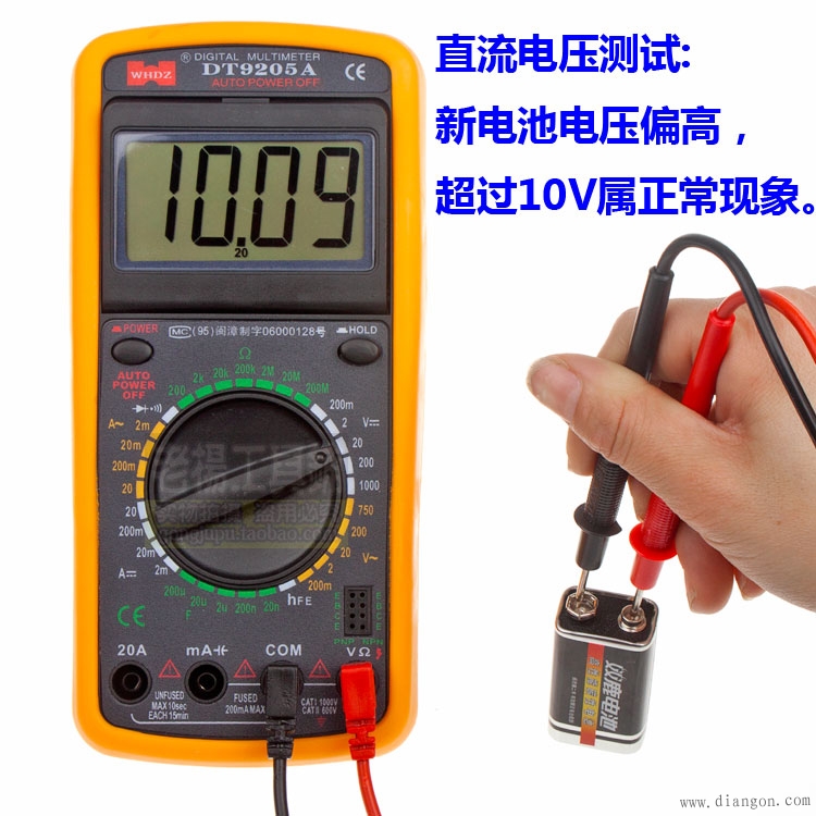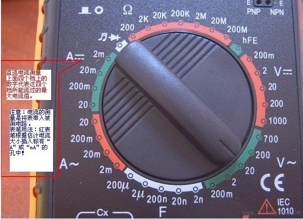 数字万用表相对来说,属于比较简单的测量仪器。本篇,作者就教大家数字万用表的正确使用方法。从数字万用表的电压、电阻、电流、二极管、三极管、MOS场效应管的测量等测量方法开始,让你更好的掌握万用表测量方法。 一、电压的测量 1、直流电压的测量,如电池、随身听电源等。首先将黑表笔插进“com”孔,红表笔插进“V Ω ”。把旋钮选到比估计值大的量程 (注意:表盘上的数值均为最大量程,“V-”表示直流电压档,“V~”表示交流电压档,“A”是电流档),接着把表笔接电源或电池两端;保持接触稳定。数 值可以直接从显示屏上读取,若显示为“1.”,则表明量程太小,那么就要加大量程后再测量工业电器。 如果在数值左边出现“-”,则表明表笔极性与实际电源极性相反,此时红表笔接的是负极。 2、交流电压的测量。表笔插孔与直流电压的测量一样,不过应该将旋钮打到交流档“V~”处所需的量程即可。交流电压无正负之分,测量方法跟前面相同。 无论测交流还是直流电压,都要注意人身安全,不要随便用手触摸表笔的金属部分。 二、电流的测量 1、直流电流的测量。先将黑表笔插入“COM”孔。若测量大于200mA的电流,则要将红表笔插入“10A”插孔并将旋钮打到直流 “10A”档;若测量小于200mA的电流,则将红表笔插入 “200mA”插孔,将旋钮打到直流200mA以内的合适量程。调整好后,就可以测量了。将 万用表串进电路中,保持稳定,即可读数。若显示为“1.”,那么就要加大量程;如果在数值左边出现“-”,则表明电流从黑表笔流进万用表。 交流电流的测量。测量方法与1相同,不过档位应该打到交流档位,电流测量完毕后应将红笔插回“VΩ”孔,若忘记这一步而直接测电压,哈哈!你的表或电 源会在“一缕青烟中上云霄”--报废! 三、电阻的测量 将表笔插进“COM”和“VΩ”孔中,把旋钮打旋到“Ω”中所需的量程,用表笔接在电阻两端金属部位,测量中可以用手接触电阻,但 不要把手同时接触电阻两端,这样会影响测量精确度的--人体是电阻很大但是有限大的导体。读数时,要保持表笔和电阻有良好的接触;注意单位:在“200” 档时单位是“Ω”,在“2K”到“200K“档时单位为 “KΩ ”,“2M”以上的单位是“MΩ”。 四、二极管的测量 数字万用表可以测量发光二极管,整流二极管……测量时,表笔位置与电压测量一样,将旋钮旋到“ ”档;用红表笔接二极管的正极,黑表笔接负极,这时会 显示二极管的正向压降。肖特基二极管的压降是0.2V左右,普通硅整流管(1N4000、1N5400系列等)约为0.7V,发光二极管约为 1.8~2.3V。调换表笔,显示屏显示“1.”则为正常,因为二极管的反向电阻很大,否则此管已被击穿。 五、三极管的测量 表笔插位同上;其原理同二极管。先假定A脚为基极,用黑表笔与该脚相接,红表笔与其他两脚分别接触其他两脚;若两次读数均为0.7V左右,然后再用红 笔接A脚,黑笔接触其他两脚,若均显示"1",则A脚为基极,否则需要重新测量,且此管为PNP管。那么集电极和发射极如何判断呢?数字表不能像指针表那 样利用指针摆幅来判断,那怎么办呢?我们可以利用“hFE”档来判断:先将档位打到“hFE”档,可以看到档位旁有一排小插孔,分为PNP和NPN管的测量。(https://www.diangon.com/ 版权所有)前面已经判断出管型,将基极插入对应管型“b”孔,其余两脚分别插入“c”,“e”孔,此时可以读取数值,即β值;再固定基极,其余两脚对调; 比较两次读数,读数较大的管脚位置与表面“c”,“e”相对应。 小技巧:上法只能直接对如9000系列的小型管测量,若要测量大管,可以采用接线法,即用小导线将三个管脚引出。这样方便了很多哦。 六、MOS场效应管的测量 N沟道的有国产的3D01,4D01,日产的3SK系列。G极(栅极)的确定:利用万用表的二极管档。若某脚与其他两脚间的正反压 降均大于2V,即显示“1”,此脚即为栅极G。再交换表笔测量其余两脚,压降小的那次中,黑表笔接的是D极(漏极),红表笔接的是S极(源极)。 一、电压档: 在检测或制作时,可以用来测量器件的各脚电压,与正常时的电压比较,即可得出是否损坏。还可以用来检测稳压值较小的稳压二极管的稳压值,其原理如 图:R为1K,电源端的电压视稳压管的标称稳压值而定,一般比标称电压大3V以上,但不要超过15V。再用万用表检测D管两端电压值,此值既为D管实际稳 压值。 二、电流档 将表串入电路中,对电流进行测量和监视,若电流远偏离正常值(凭经验或原有正常参数),必要时可以调整电路或者需要检修。还可以利用该表的20A档测 量电池的短路电流,即将两表笔直接接在电池两端。切记时间绝对不要超过1秒!注意:此方法只适用于干电池,5号,7号充电电池,且初学者要有熟悉维修的人 员指导下进行,切不可自行操作!根据短路电流即可判断电池的性能,在满电的同种电池的情况下,短路电流越大越好。 三、电阻档; 可用于判断电阻,二极管,三极管好坏的方法之一。对于电阻其实际阻值偏离标称值过多时则已损坏。对于二三极管,若任两脚间的电阻都不为很大值(几百K 以上),则可认为性能下降或者已击穿损坏,注意此三极管是不带阻的。此法也可用于集成块,须要说明的是:集成块的测量只能和正常时参数作比较。 四、现在普通万用表的表笔都存在阻值较大,有兴趣的爱好者可自行制作一副表笔;方法:准备一米左右的优质音箱线或者多蕊铜电线,带绝缘套的夹子