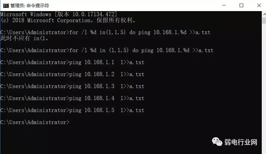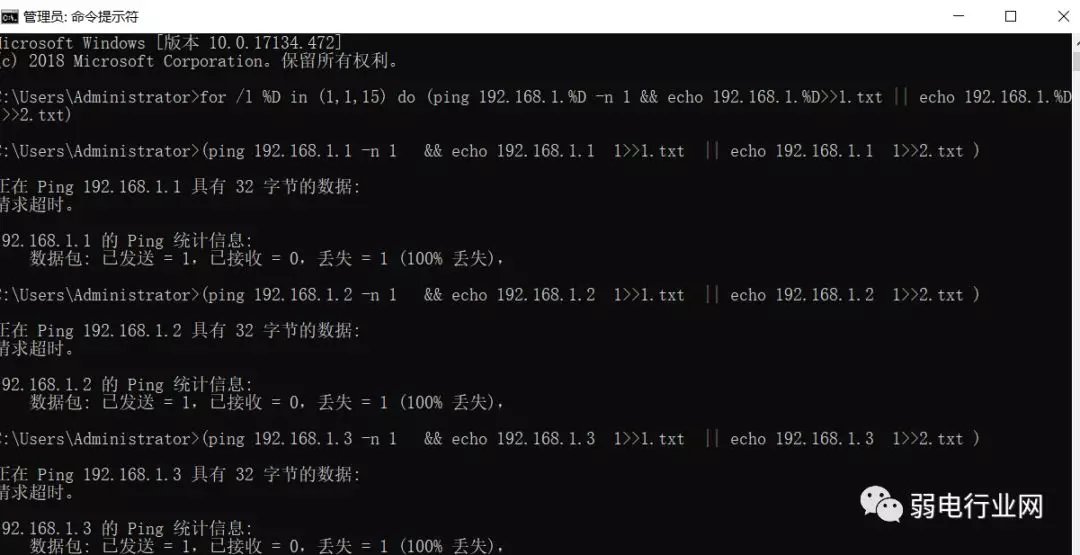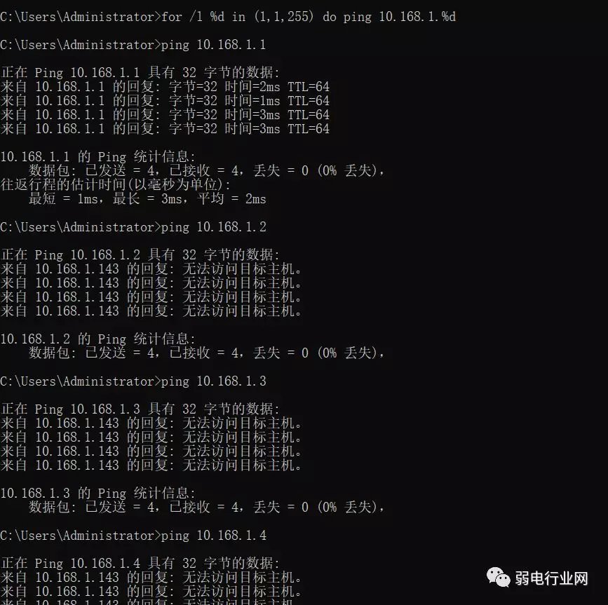 一、批量ping网段 对于一个网段ip地址众多,如果单个检测实在麻烦,那么我们可以直接批量ping网段检测,那个ip地址出了问题,一目了然。 先看代码,直接在命令行窗口输入: for /L %D in (1,1,255) do ping 10.168.1.%D IP地址段修改成你要检查的IP地址段。 当输入批量命令后,那么它就自动把网段内所有的ip地址都ping完为止。 那么这段“for /L %D in(1,1,255) do ping 10.168.1.%D” 代码是什么意思呢? 代码中的这个(1,1,255)就是网段起与始,就是检测网段192.168.1.1到192.168.1.255之间的所有的ip地址,每次逐增1,直接到1到255这255个ip检测完为止。 二、批量ping网段命令升级 上面的命令虽然能批量ping 地址,但是上面代码在命令行窗口显示数量多的时候看起来也很麻烦,那么我们再升级一下,用下面的代码。 for /L %D in (1,1,255) do ping -n 10.168.1.%D >>a.txt 说明,ip地址是变的,你填你需要测的ip网段就行,a.txt也是变的,可以自已设置名称。 这样就会把结果导入的a.txt文件中,全部IP检查完成后打开a.txt搜索“TTL=”包含它的就是通的地址,没有包含“TTL=”的地址就是不通的。如下图 打开后,就直接搜索没TTL的就可以了。