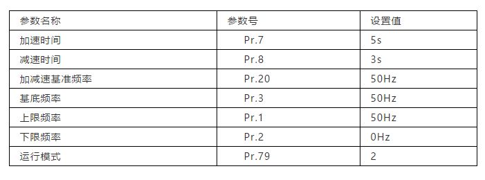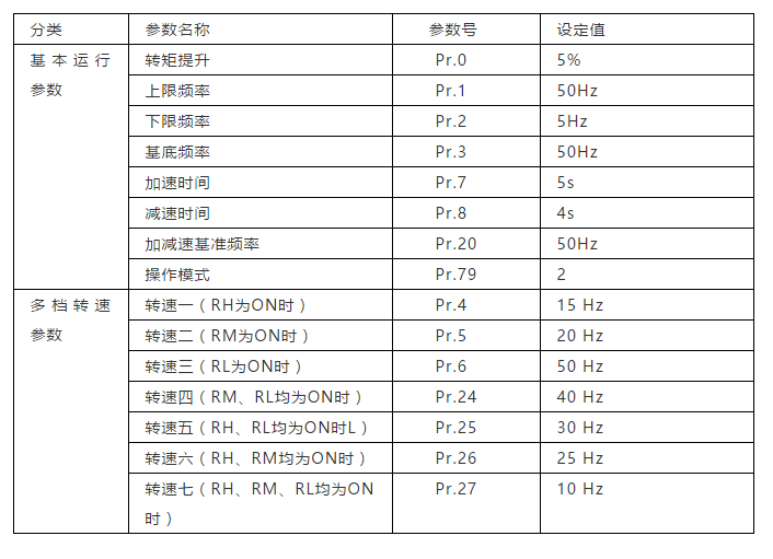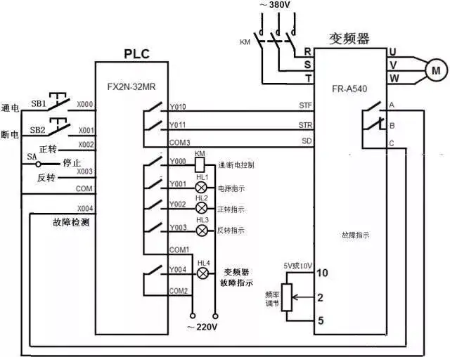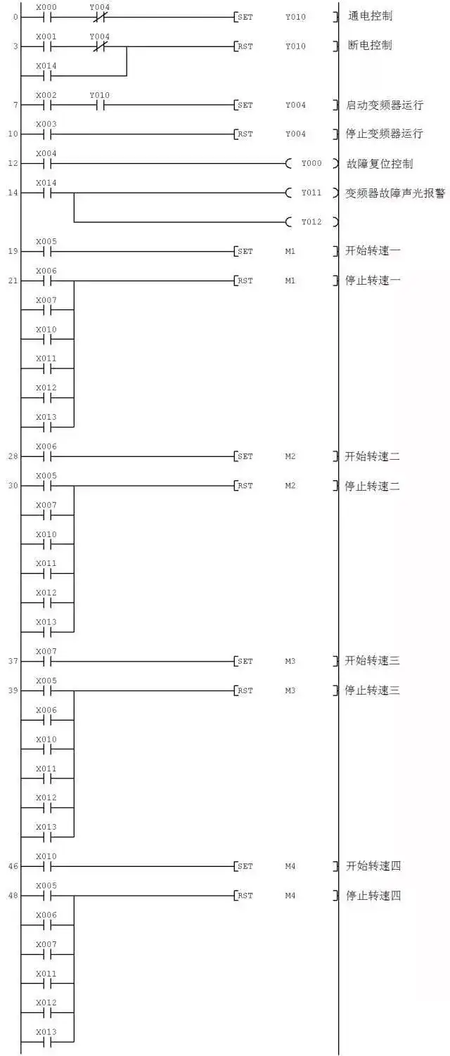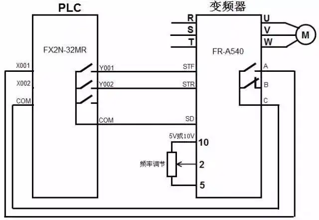 (2)多台变频器与PLC的RS485通信连接 多台变频器与PLC的RS485通信连接如下图所示,它可以实现一台PLC控制多台变频器的运行。  (四)PLC控制变频器驱动电动机正反转的电路、程序及参数设置 1.PLC与变频器的硬件连接线路图 PLC以开关量方式控制变频器驱动电动机正反转的线路图如下图所示。  2.变频器的参数设置 在使用PLC控制变频器时,需要对变频器进行有关参数设置,具体见下表。  3.编写PLC控制程序 变频器有关参数设置好后,还要用编程软件编写相应的PLC控制程序并下载给PLC。PLC控制变频器驱动电动机正反转的PLC程序如下图所示。 (五)PLC控制变频器驱动电动机多档转速运行的电路、程序及参数设置 变频器可以连续调速,也可以分档调速,FR-500系列变频器有RH(高速)、RM(中速)和RL(低速)三个控制端子,通过这三个端子的组合输入,可以实现7档转速控制。如果将PLC的输出端子与变频器这些端子连接,就可以用PLC控制变频器来驱动电动机多档转速运行。 1.PLC与变频器的硬件连接线路图 PLC以开关量方式控制变频器驱动电动机多档转速运行的线路图如下图所示。 不外接控制器(如PLC)的情况下,直接操作变频器有三种方式: ①操作面板上的按键; ②操作接线端子连接的部件(如按钮和电位器); ③复合操作(如操作面板设置频率,操作接线端子连接的按钮进行启/停控制)。为了操作方便和充分利用变频器,也可以采用PLC来控制变频器。 外接控制器(如PLC)的情况下,间接操作变频器有三种基本方式: ①以开关量方式控制; ②以模拟量方式控制; ③以通信方式控制。 (一)PLC以开关量方式控制变频器的硬件连接 变频器有很多开关量端子,如正转、反转和多档转速控制端子等,不使用PLC时,只要给这些端子接上开关就能对变频器进行正转、反转和多档转速控制。当使用PLC控制变频器时,若PLC是以开关量方式对变频进行控制,需要将PLC的开关量输出端子与变频器的开关量输入端子连接起来,为了检测变频器某些状态,同时可以将变频器的开关量输出端子与PLC的开关量输入端子连接起来。 PLC以开关量方式控制变频器的硬件连接如下图所示。当PLC内部程序运行使Y001端子内部硬触点闭合时,相当于变频器的STF端子外部开关闭合,STF端子输入为ON,变频器启动电动机正转,调节10、2、5端子所接电位器可以改变端子2的输入电压,从而改变变频器输出电源的频率,进而改变电动机的转速。如果变频器内部出现异常时,A、C端子之间的内部触点闭合,相当于PLC的X001端子外部开关闭合,X001端子输入为ON。 (二)PLC以模拟量方式控制变频器的硬件连接 变频器有一些电压和电流模拟量输入端子,改变这些端子的电压或电流输入值可以改变电动机的转速,如果将这些端子与PLC的模拟量输出端子连接,就可以利用PLC控制变频器来调节电动机的转速。模拟量是一种连续变化的量,利用模拟量控制功能可以使电动机的转速连续变化(无级变速)。 PLC以模拟量方式控制变频器的硬件连接如下图所示,由于三菱FX2N-32MR型PLC无模拟量输出功能,需要给它连接模拟量输出模块(如FX2N-4DA),再将模拟量输出模块的输出端子与变频器的模拟量输入端子连接。当变频器的STF端子外部开关闭合时,该端子输入为ON,变频器启动电动机正转,PLC内部程序运行时产生的数字量数据通过连接电缆送到模拟量输出模块(DA模块),由其转换成0~5V或0~10V范围内的电压(模拟量)送到变频器2、5端子,控制变频器输出电源的频率,进而控制电动机的转速,如果DA模块输出到变频器2、5端子的电压发生变化,变频器输出电源频率也会变化,电动机转速就会变化。 PLC在以模拟量方式控制变频器的模拟量输入端子时,也可同时用开关量方式控制变频器的开关量输入端子。 (三)PLC以通信方式控制变频器的硬件连接(以RS485为例) PLC以开关量方式控制变频器时,需要占用较多的输出端子去连接变频器相应功能的输入端子,才能对变频器进行正转、反转和停止等控制;PLC以模拟量方式控制变频器时,需要使用DA模块才能对变频器进行频率调速控制。如果PLC以RS485通信方式控制变频器,只需一根RS485通信电缆(内含5根芯线),直接将各种控制和调频命令送给变频器,变频器根据PLC通过RS485通信电缆送来的指令就能执行相应的功能控制。 RS485通信是目前工业控制广泛采用的一种通信方式,具有较强的抗干扰能力,其通信距离可达几十米至上千米。采用RS485通信不但可以将两台设备连接起来进行通信,还可以将多台设备(最多可并联32台设备)连接起来构成分布式系统,进行相互通信。 当然还有其它的通讯方式,比如PROFIBUS和Ethernet等。 1.变频器的RS485通信口 三菱FR500系列变频器有一个用于连接操作面板的PU口,该接口可用作RS485通信口,在使用RS485方式与其他设备通信时,需要将操作面板插头(RJ45插头)从PU口拔出,再将RS485通信电缆的一端插入PU口,通信电缆另一端连接PLC或其他设备。三菱FR500系列变频器PU口外形及各引脚功能说明如下图所示。 三菱FR500系列变频器只有一个RS485通信口(PU口),面板操作和RS485通信不能同时进行,而三菱FR700系列变频器除了有一个PU接口外,还单独配备了一个RS485通信口(接线排),专用于进行RS485通信。三菱FR700系列变频器RS485通信口外形及各脚功能说明如下图所示,通信口的每个功能端子都有2个,一个接上一台RS485通信设备,另一个端子接下一台RS485通信设备,若无下一台设备